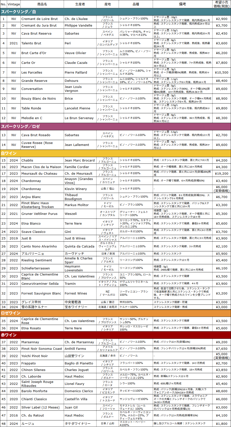 スパークリングは白12種類とロゼ2種類、白ワイン20種類、ロゼワイン2種類、赤ワイン12種類の計48種類。過去最大レベルで幅広く用意しました。