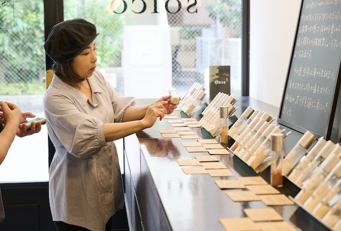 悩みながら、楽しみながら塩を探すという意味で、体験型ミュージアムのような店といえます。容器を揃えたのも、中に入れた塩の個性を際立てたかったからです。どんな容器にするか考えたとき、大学時代に使っていた試験管を思いついて(田中さんは理系出身)。試行錯誤をくり返してこの形になりました。いくつか揃えたいときもスリムなので、キッチンが狭くてもたくさん置けます。塩は、料理によって使い分けできることも提案したかったことなので。