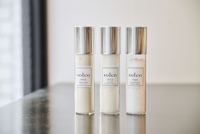 海水から作られた海塩。よく見ると粒の大きさ、色も微妙に違う。左よりサンゴのカルシウムが含まれる「うるわしの花塩」、高知県で天日干しで作られる「山塩小僧」、北海道十勝で牛たちのために作られた「十勝の塩」