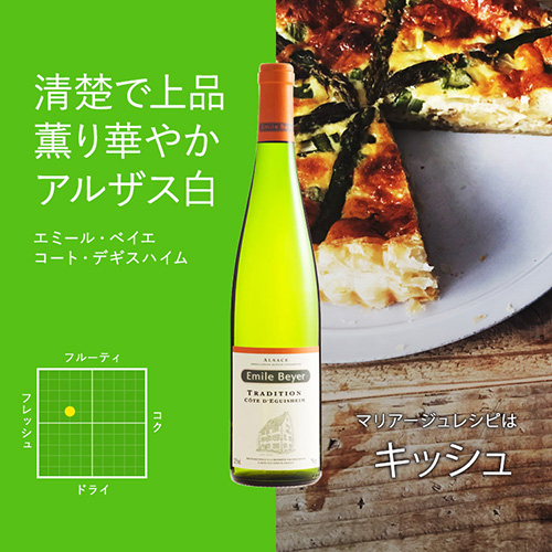 自宅で作った料理を持って行ってワインディナー・・・そんな時にはこんなお料理だと持ち運びがしやすいですよ。フランスはアルザス・ロレーヌ地方の郷土料理「キッシュ」。冷凍パイ生地をベースに簡単に作れちゃうCLUB30レシピは、卵の優しい味とベーコンのしっかり風味がワインにばっちり合う大人仕様。アルザスの白ワイン『コート・デギスハイム』の上品で優美な味わいが、実にぴったりと合ってくれます。郷土料理と地元のワインという組み合わせは、長年寄り添いあった夫婦のような安定のマリアージュ。バレンタインディナーの前菜にも、おすすめです! レシピはコチラ!
