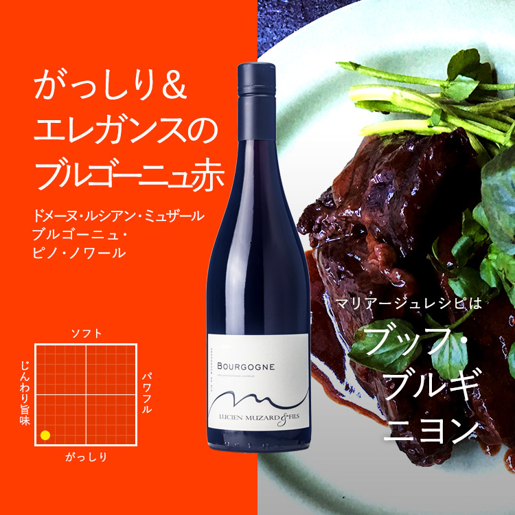 さて、バレンタインのマリアージュ6選、最後を締めくくるのはフレンチ肉料理王道中の王道、「ブフ・ブルギニヨン(牛肉の赤ワイン煮込み)」に、力強く旨みと深みに満ちたブルゴーニュ産赤ワイン『ルシアン・ミュザール ブルゴーニュ・ピノ・ノワール』のマリアージュ!今年のバレンタインはお料理ちょっと頑張ろうかな??という方には是非ともこの組み合わせをお勧めしたいと思います。仕込みは前の日から・・・とはいえ肉と野菜を漬け込んでおくことだけ。あとは時間をかけてじっくりと煮込みつつワインとのとろけるようなマリアージュに思いを馳せましょう。短時間でパパっと作ってもおいしい料理、たくさんあります。でも・・・時間をかけたらかけただけの美味しさと感動が還ってくるのも料理の楽しさ。大切な人を想いつつ、素晴らしいマリアージュをご自身でプロデュースしてください!! レシピはコチラ!