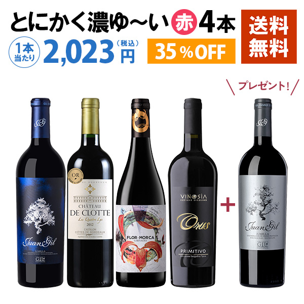 このセットのコンセプトはとてもシンプル。「とにかく濃ゆ~い赤」を揃えました。濃厚赤が好きな方に、安心して楽しんでいただける内容になっています。そして4本に加えて、特典でさらに1本ついてくるという充実感。赤ワイン党の方にはまさにうってつけの常設セットです。